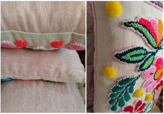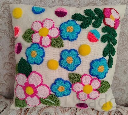 . выполнены техникой ковровая вышивка лицевая сторона 100% хлопок (двунитка) вышивка пряжей акрил/хлопок/шерсть обратная сторона портьерная ткань наволочка не съемная . наполнитель синтешар и синтепух 2 шт. размеры 35*35см по 2600р. размер 35*55см. - 3200р. .